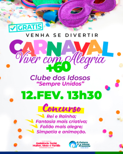 A alegria do Carnaval também mora nas histórias, nas memórias e nos encontros que atravessam o tempo. Pensando nisso, o Clube dos Idosos Sempre Unidos recebe o Carnaval Viver com Alegria 60+, uma tarde especialmente preparada para celebrar a convivência, o bem-estar e a valorização da pessoa idosa.